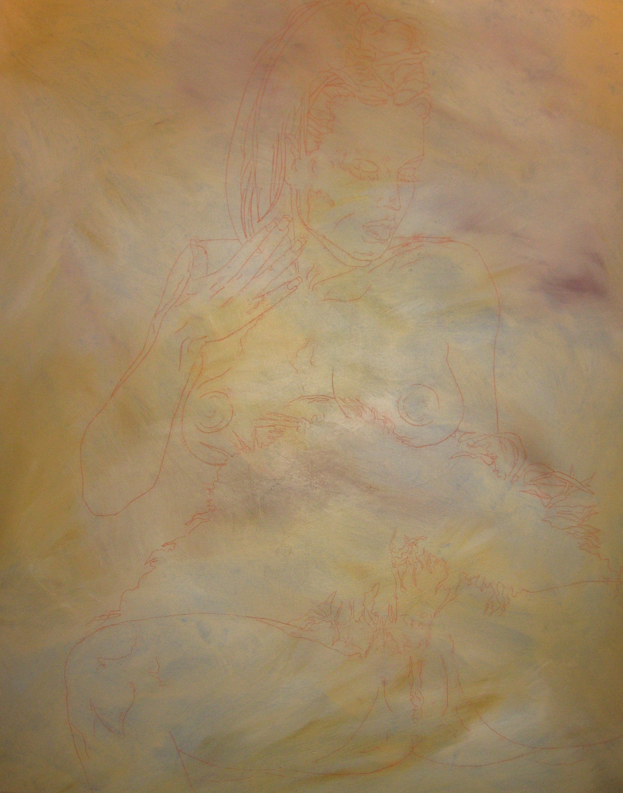 I like to sketch an image onto the canvas before painting, particularly for figure painting, which I am quite fussy about when it comes to detail. This work I sketched in pastel, though I usually use watercolour pencil – both allowing for easy corrections and pre-painting clean-up without making a mess of your freshly primed canvas. I deliberately omit any shadows or highlights at this stage in the work, except for perhaps a few basic indicator lines of shadow, leaving only clearly defined outlines and details which dissolve and disappear nicely as the paint is applied.
