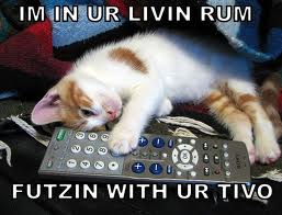 My pussy loves technology and if she can find a way to get involved, there is no stopping her! Her latest favourite game is ‘mouse murder’ (her ‘pussy cat pom-pom mice’!) Clenched in her jaws she holds it against any cord with a live electric current running through it until it dies, before tearing it to shreds. Vicious little minx! This is wonderfully funny to watch, but when the t.v. aerial cable becomes her weapon of choice and something is taping , it is an extreme frustration! But that is not the least of it!